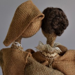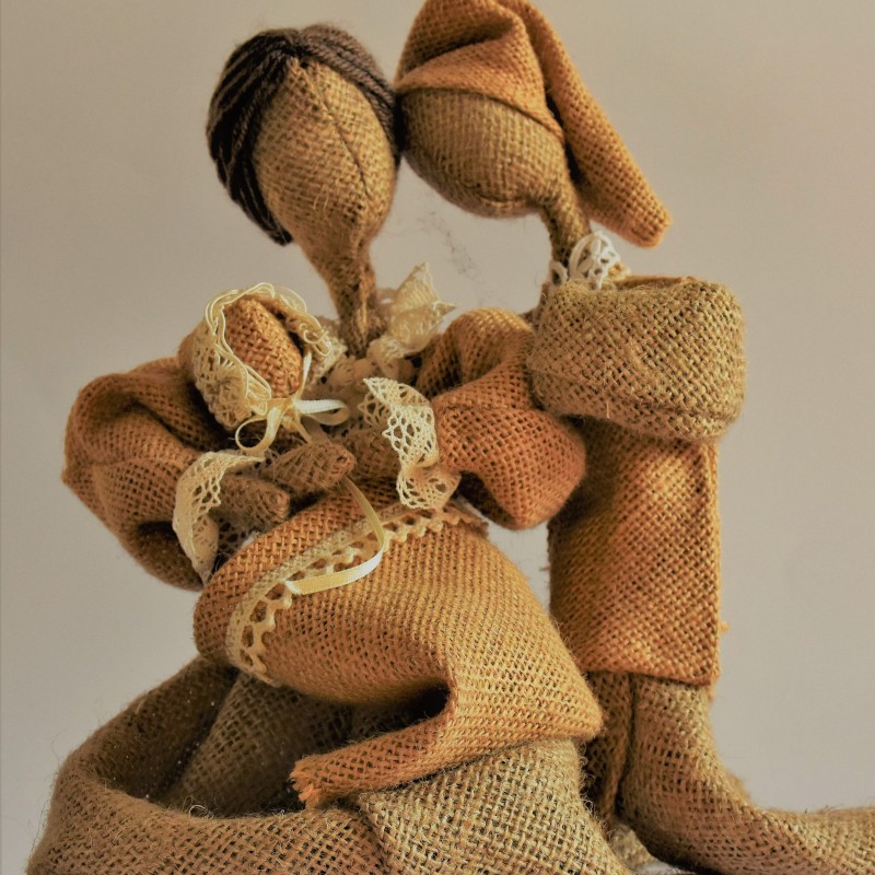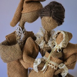Natività composta da tre elementi elaborata a mano, in juta, cotono, lino e merletti.