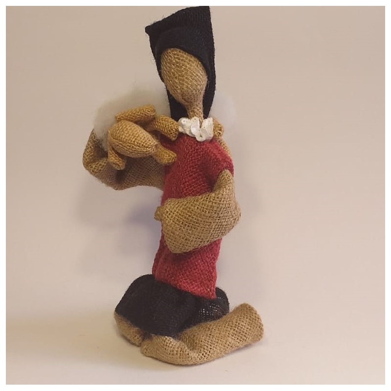 Pupazzo che impersona un pastorello sardo che porta sulle spalle un agnello in difficoltà. Fatto a mano con ago e filo. Confezionato in tessuto di juta, cotone e lino. I tesuti sono colorati con la tecnica antica di tinteggiatura con erbe e bacche spontanee della flora sarda.Può essere un personaggio del presepe con l'aggiunta anche delle pecorelle che trovate in vendita in questo catalogo.